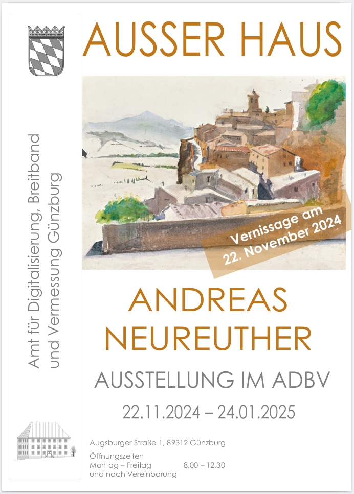 Am Freitag, 22. November 2024, um 19.00 Uhr, findet im Amt für Digitalisierung, Breitband und Vermessung Günzburg die Eröffnung der Kunstausstellung mit Werken des Künstlers Andreas Neureuther statt. Unter dem Titel „AUSSER HAUS“ präsentiert der ehemalige Abteilungsleiter des Staatlichen Bauamtes Krumbach und Baudezernent der Stadt Nürtingen Aquarelle aus der Region und aus dem Mittelmeerraum.